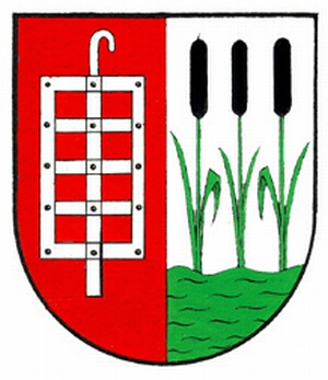 In rot vor silbern gespaltenem Schilde vorn ein silberner Gitterrost, hinten aus grünen Wellen wachsen drei grüne Riedgräser mit schwarzen Kolben.