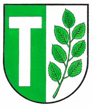 Von Grün und Silber gespalten, vorn schwebend ein silbernes Antoniuskreuz, hinten ein siebenblättriger, grüner Buchenzweig.