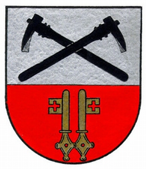 In silbern über rot geteiltem Schilde oben zwei schragenförmig gekreuzte Rodehacken, unten zwei abgewendete, aufrechte goldene Schlüssel mit viereckigem Schließblatt.