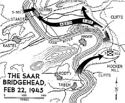 Am 22. Februar 1945 überquerten die Amerikaner die Saar bei Taben und Staadt. Bei Staadt griff das 3. Bataillon vom 301. Regiment der 94. Infanteriedivision an, bei Taben waren es von der gleichen Division das 1. und das 3. Bataillon vom 302. Regiment. Das 3. Bataillon sollte den Höckerberg erobern. Das 1. Bataillon sollte über den Höhenweg zur schönen Aussicht vorstoßen. Die Kompanien A und Bundesstraße sollten von dort nach Serrig vorrücken, und die Kompanie C das Serriger Bachtal überqueren.