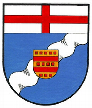 Unter silbernem Schildhaupt, darin ein rotes Balkenkreuz, in Blau ein silberner schräglinker Wellenbalken, belegt mit goldenem Schildchen, darin zwei rote Balken, begleitet von zwölf (5:4:3) reihenweise gelegten, viereckigen (quadratischen) roten Steinen