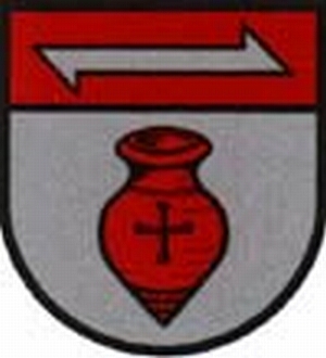 Unter rotem Schildhaupt mit liegendem silbernem Doppelhaken, in Silber ein roter Ölkrug mit gemeinem Kreuz belegt.