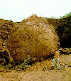 Wir glauben eher an folgende Art ihrer Entstehung: Die Tätigkeit des Vulkans war keine gleichmäßige. Zeiten eines relativ ruhigen Ausfließens von Basaltmagma, die ja das Alftal zum Teil ausgefüllt haben, wechselten ab mit Zeiten heftiger Eruptionen, wobei ein sehr gasreiches Magma gefördert wurde. Bei dieser heftigen Eruptionstätigkeit ist es nicht unvorstellbar, dass sich der Schlot, wie man das auch an den heute tätigen Vulkanen beobachten kann, immer wieder neue Wege gesucht hat. Dabei können geringe Teile des Kraters weggerissen werden, und es können schon erkaltete Basaltdecken wieder in den Schlot, das heißt in die glühende Magma zurückfallen. Wir glauben, dass ein Stück der Basaltdecke erneut angeschmolzen wurde und nach längerem Aufenthalt im Magma ihre runde Gestalt durch anschmelzen erhalten hat. [1]
