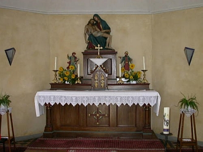Im schlichten Innenraum ein einfacher Altar des frühen 20. Jahrhunderts. [1]