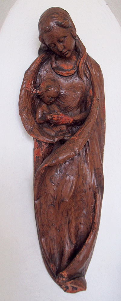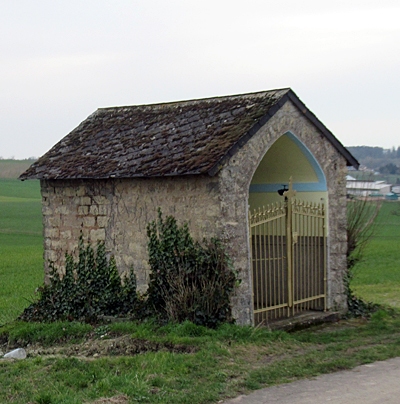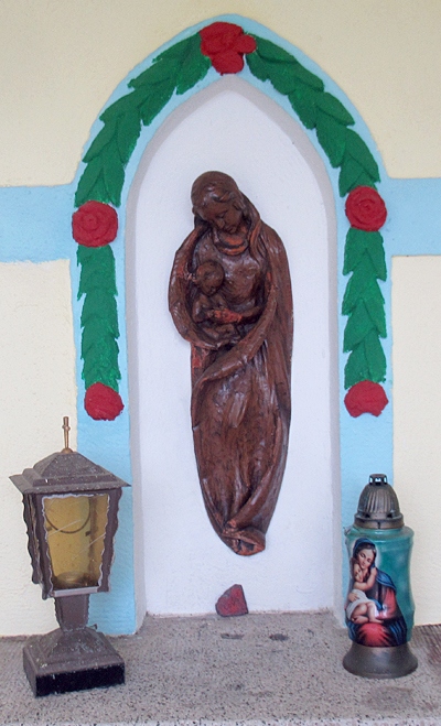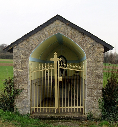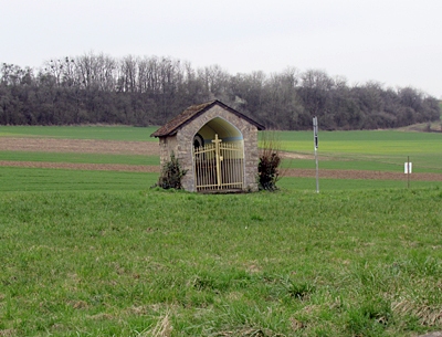 Kapelle, Bruchsteinbau mit Eingangsgitter. Im Inneren Nische mit holzgeschnitzter Madonna-mit-Kind-Figur. [2]