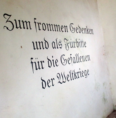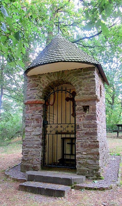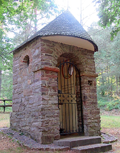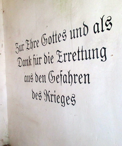Für die gnädige Errettung aus den Gefahren des Krieges gestiftete Kapelle. Daneben Fragment eines Grabsteines und Grenzstein der Gemeinden Hamm (GH) und Taben (T). [1]