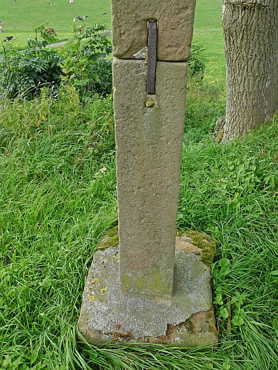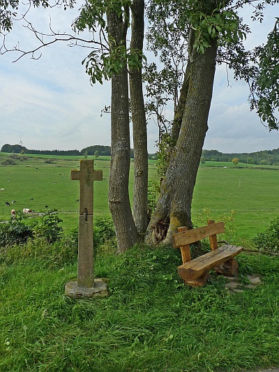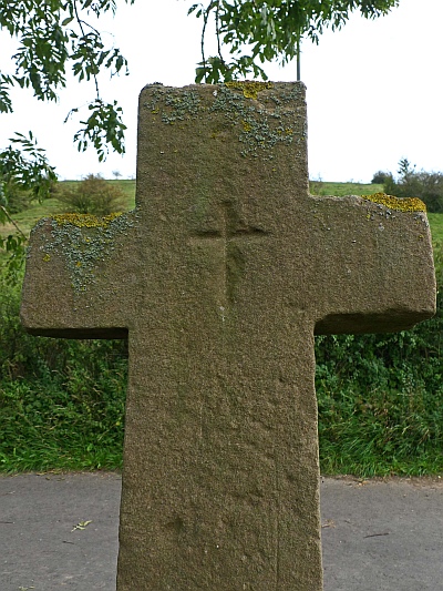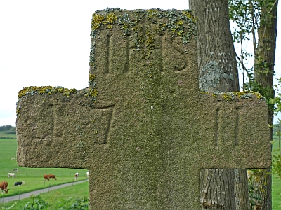 Südwestlich des Ortes, an einem Feldweg Richtung Wallersheim. Hohes, ganz schlichtes Balkenkreuz in altem Fundamentstein. Auf dem Querbalken die Jahreszahl 1711, darüber das IHS-Zeichen. In seiner Art auch in der weiteren Umgebung singulär, vielleicht kopierender Ersatz eines älteren Kreuzes. [1]