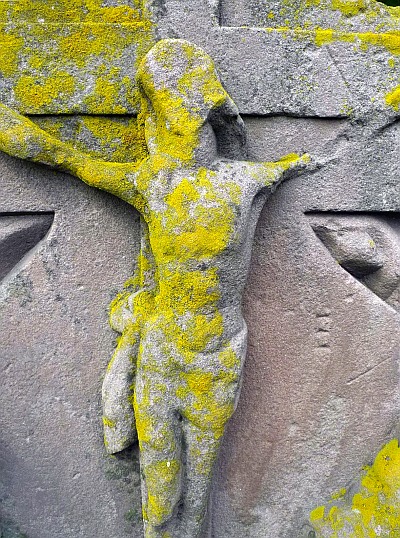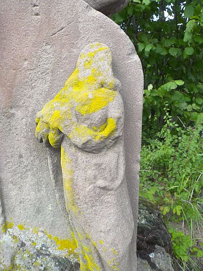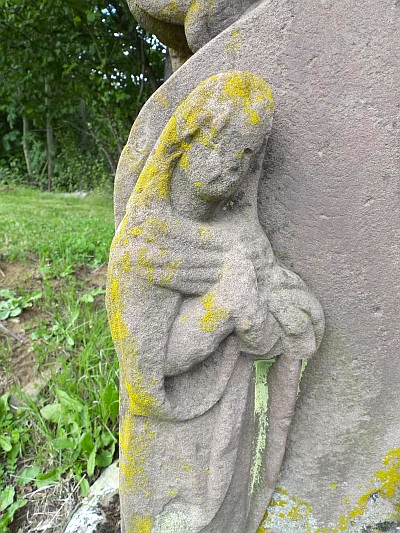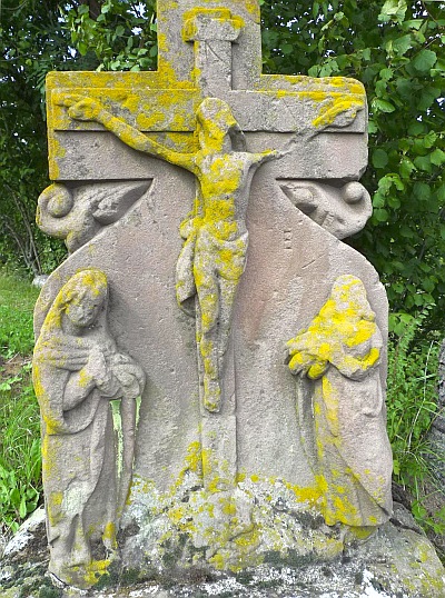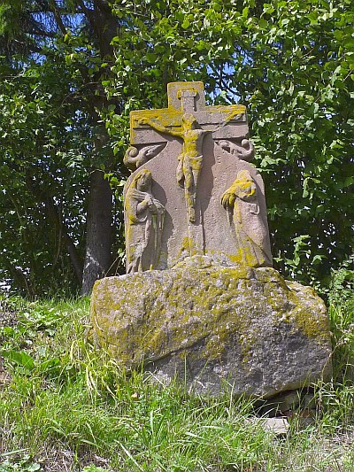 Von dem ehemaligen Kreuzigungsbildstock sind nur noch der Fundamentstein und der an den Figuren stark bestoßene Aufsatz erhalten. Dieser nach dem Vorbild des sogenannten Schönecker Typs, wegen der knorpeligen Voluten zwischen dem Kielbogenabschluß der Reliefplatte und dem Querbalken des Kreuzes aber vermutlich jünger. [1]