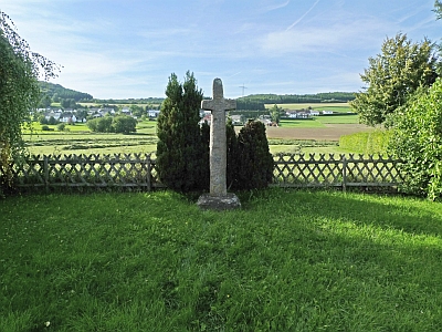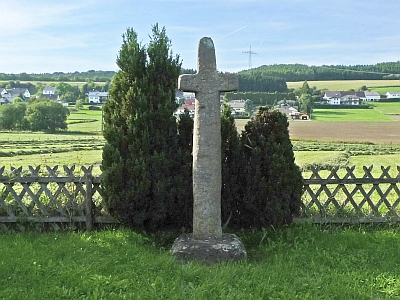 Sehr altertümlich wirkendes, knapp zwei Meter hohes Balkenkreuz. Der nach oben leicht verjüngte Kreuzstamm von querovalem, der kurze Querbalken von rechteckigem Querschnitt. Als einzige Verzierung am Schnittpunkt von Stamm und Querbalken ein flach eingeritztes, von einem Kreis umschlossenes Kreuz. Wegen fehlender Vergleichsbeispiele ist eine Datierung nur allgemein ins Mittelalter möglich, doch handelt es sich bei dem Kreuz sicher um das weitaus älteste der Region. [1]