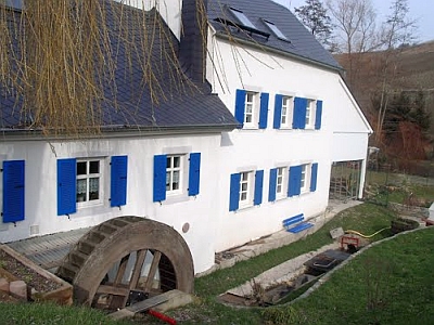 Ältester Teil der in verschiedenen Bauphasen erweiterten Mühle ist das an den Hang gebaute, straßenseitig einngeschossige Wohnhaus mit hohem schiefereingedecktem Walmdach. Datierung am Türsturz 1642. Erhalten ist der mächtige Kamin mit heute eingedecktem Rauchmantel. Zum Bach setzt sich winkelförmig der Mühlenteil und das 1855 bezeichnete Stall- Scheunengebäude an. Die im historischen Eindruck erhaltene Mühle hat als seltenes hausgeschichtliches Beispiel für eine Laube des 17. Jahrhunderts besondere Bedeutung. [2]