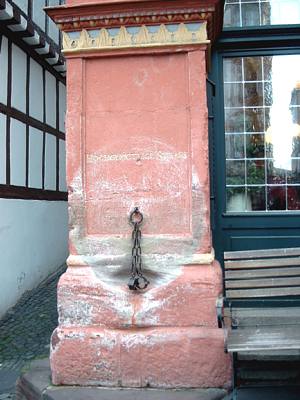 Das Erdgeschoss der Fassade zeigt links und rechts von der erkertragenden Säule je einen Rundbogen der einst offenen Halle, von der die eine Hälfte als Spritzenhaus diente und die andere Hälfte die Mehlwaage barg. Am Eckpfeiler links vom Beschauer war der Pranger mit Ketten und Handschellen, an welche einst die Übeltäter an den öffentlichen Schandpfahl oder die Schandsäule gefesselt wurden, wie die darüber eingemei13elte Schrift Hochgerichtliche Straff und Bürgerliche Züchtigung meldet. Zwei massive und doch zierliche Dachfensteraufbauten stehen vor dem Walmdach, das mit spiralenverzierter Eisenblume auf der Spitze endet.