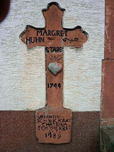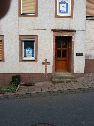 In die Fassade des Hauses, das von 1856 bis 1908 als Schule diente, ist ein kleines Steinkreuz in Form eines Kleeblattkreuzes eingesetzt. Die Inschrift auf den Kreuzbalken MARGRET HUHN STARB 1744 offenbar zum großen Teil erneuert, in ganzer Länge alt nur die Inschrift auf dem Kreuzsockel: VALANTIN SCHWICKRATH CHATRINA SCHWICKRATH 1789. Das Kreuz dürfte ursprünglich ein Grabkreuz gewesen sein. [1]
