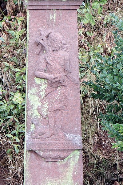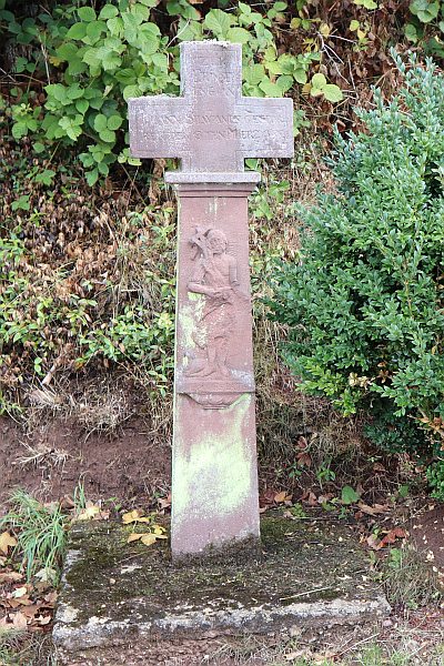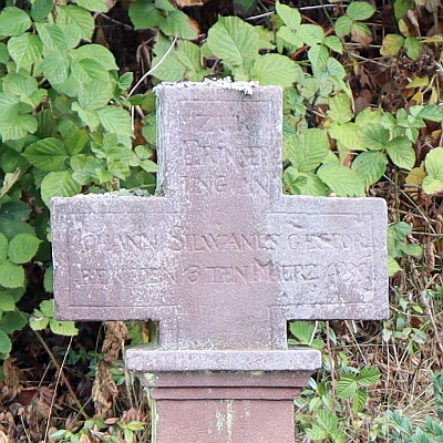 Im Abzweig des Weges nach Steinborn: Das kleine, am Hang oberhalb der Straße stehende Schaftkreuz weist schon durch seine Form auf ein Totengedächtnis hin. Der schlanke, leicht nach oben verjüngte Schaft trägt nur die Relieffigur Johannes des Täufers, während die Inschrift ZUR ERINNERUNG AN IOHANN SILWANUS, GESTORBEN DEN 13TEN MAERZ 1838 ganz das ungewöhnlich niedrige Abschlußkreuz bedeckt und keinen Platz für den sonst üblichen Korpus lässt. Der in der Inschrift Genannte wurde hier beim Steinebrechen durch herabstürzendes Geröll erschlagen. [1]
