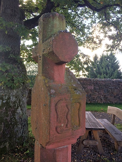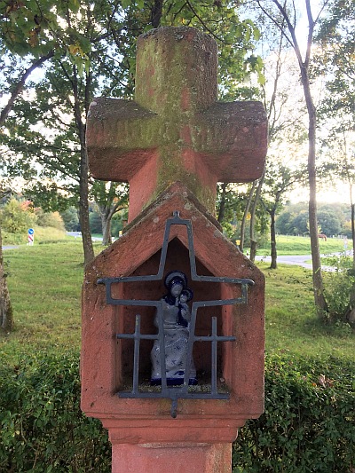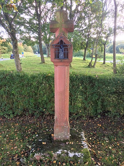 An der Straße Richtung Rothaus-Trier. Nischenkreuz des 16. Jahrhunderts, von der Jahreszahl auf dem Querbalken des Abschlusskreuzes nur noch die beiden ersten Ziffern eindeutig zu erkennen. Das breite, auf den Seitenwänden durch Reliefs verzierte (links ein Krug als Zeichen des Töpferhandwerks?) Nischengehäuse sitzt ohne Übergang auf dem achtseitigen Schaft, dessen oberes Ende offenbar fehlt. Das Abschlußkreuz niedrig mit ganz kurzem Kreuzstamm. [1]