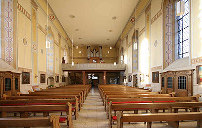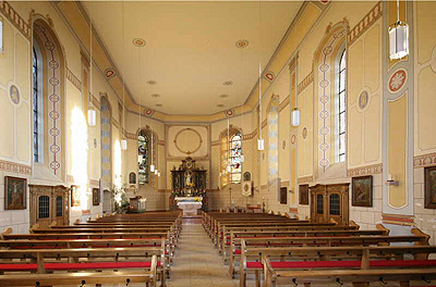 Der Innenraum über einer Voute flachgeschlossen, im Westen auf zwei Stützen die leicht konvexe Orgelempore ohne Anschluß an den Turm. Die Ausstattung zeigt eine nicht glückliche Mischung der Relikte mehrerer Erneuerungen (1872, 1920er und 1960er Jahre).