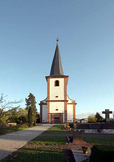 Der klare, weite Saalbau mit Dreiseitschluß und einfachen, hohen Rundbogenfenstern wurde 1789-92 an der Stelle schon zweier Vorgängerbauten errichtet, eine typische, recht anspruchslose Landkirche in strengerer, spätbarocker Form. Der nur zweigeschossige, durch die leichte, achtseitige Spitze aber gestreckt erscheinende Turm wird durch das kräftige, verkröpfte Traufgesims an das Schiff gebunden.