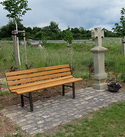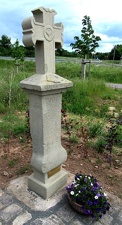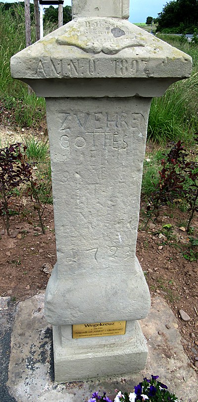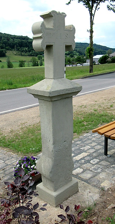 An der Abzweigung des Weges nach Kaschenbach. Der Schaft aus grauem Sandstein trägt die jetzt fast unlesbare Stifterinschrift eines GERDERT und die Jahreszahl 1723. Die Deckplatte mit der Jahreszahl 1897 und den Spruch O WANDERER BETE AN DEN GEKREUZIGTEN trug über einer wie sie aus rotem Sandstein gefertigten Kugel und ein Eisenkreuz. [1]