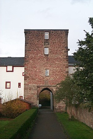 Wohl um 1131–52 über dem südwestlichen Flügel des römischen Palatiolum errichtet, Umbau im 15. und frühen 16. Jahrhundert, 1552 mit dem ganzen Ort im Feldzug des Markgrafen Albrecht von Brandenburg eingeäschert, nach Wiederaufbau(?) im französischen Erbfolgekrieg 1673/74 zerstört; Einbau zahlreicher kleiner Wohnhäuser und landwirtschaftlicher Bauten; Mauerreste in den Häusern Burgstraße 2–10, 3, 4, 5, 6, bei Nr. 2 Stumpf des polygonalen Treppenturms an der Nordwestecke, zwischen Nr. 5 und 6 Torturm mit zwei Wappen des Erzbischofs Johann II. von Baden (1456–1503); Kirchplatz 4 und 10, bei Nr. 4 auch noch Rest des nordöstlichen Eckturms); Stiftstraße 10 (heute Scheune, bezeichnet 1695); Reste des ehemalige Palas (Kellergewölbe, vom Hauptsaal vermauerte Kreuzstockfenster, Konsolen); im Vorgarten von Burgstraße 10 Reste des wohl auf römischen Fundamenten aufbauenden Bergfrieds; ehemalige Wirtschaftshof weitgehend als Freifläche mit der ehemalige Zehntscheune Residenzstraße 22 und Genovevastraße 6a erhalten. [1]
