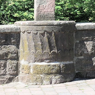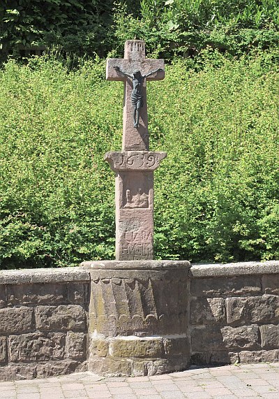 Der runde, in eine Mauer eingelassene Sockelstein eines Wegekreuzes hat schräg geführte Kanneluren, die an Wegekreuze in Wißmannsdorf erinnern. Er hält das obere Drittel eines Schafts mit dem Rest einer Inschrift CLARA HVGERIN und einem verwitterten Brustbild darüber. Über dem in das Pestjahr 1639 datierten Sattelstein befindet sich ein gut 100 Jahre jüngeres Kreuz. [2]