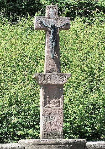 Wegekreuz; Sattelstein bezeichnet 1639, Abschlusskreuz um die Mitte des 18. Jahrhunderts. [1]