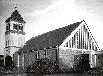 Der heutige Bau besteht aus dem neuromanischen Turm von 1901 und dem modernen Schiff von 1965/67- Der Turm entstand zusammen mit einer Erweiterung der Pfarrkirche des Jahres 1790, die der Düsseldorfer Architekt Joseph Kleesattel d.Ä., durchführte. Ecklisenen, Rundbogenfriese und profilierte Gesimse gliedern ihn, seine drei Geschosse verjüngen sich. Im Obergeschoß sind die Schallarkaden als Zwillingsfenster mit eingestellten Säulchen ausgebildet.