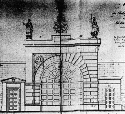 Geschmückt mit den Bildern von Minerva und Diana, einstöckiges steinernes Tor mit zwei Nebentüren.