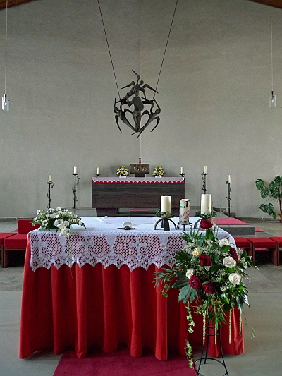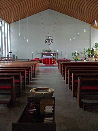 Die ursprüngliche Kapelle von 1716 wurde 1782 durch eine Kirche ersetzt, deren Grundriß man heute noch erkennen kann. Im heutigen Eingangsbereich ist links hinter dem barocken, 1984 restaurierten Altar, noch die Apsis der früheren Kirche zu sehen. Dort wo sich heute die Taufkapelle befindet, war früher der Eingang. Der erweiterte Teil der Kirche ist in Form eines Zeltes gestaltet, in dem sich das pilgernde Gottesvolk versammelt. Der neue Hauptaltar besteht aus Basaltlava und wiegt 8 Tonnen. Über dem Opferstein thront Christus als Pantokrator, umgeben von den Serafim, die ihm huldigen. Die aus der Erbauungszeit stammende Ausstattung (z.B. barocker Altar) ist angeblich aus den Werkstätten des Klosters Himmerod. [2]