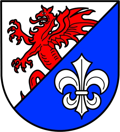 Von Silber und blau schräglinks geteilt, oben ein wachsender roter Drache, unten eine silberne Lilie.