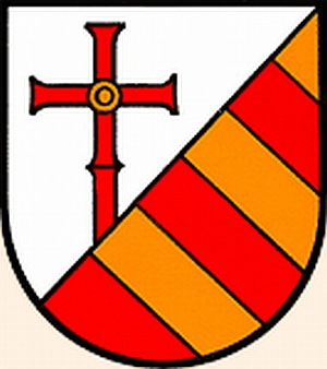 Im schräglinks geteilten Schild vorn in Silber ein aufsteigendes Tatzenkreuz in Rot, im Schnittpunkt der Balken mit goldenem Stein belegt, hinten fünfmal von Gold und Rot schrägrechts geteilt.