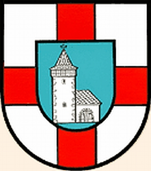 In Silber ein durchgehendes rotes Balkenkreuz, belegt mit blauem Herzschild, darin ein weißer Turm mit Anbau und schwarzem Turmkreuz und auf den Querbalkenenden aufgestecktem Kreuz.