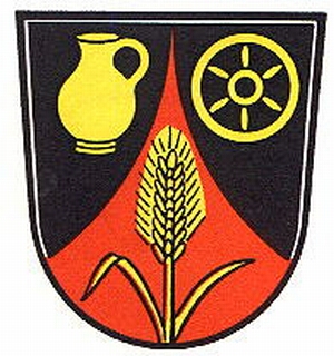 In schwarz eine eingeschweifte rote Spitze, darin eine wachsende goldene Ähre; vorne ein goldener Krug, hinten ein goldenes Töpferrad.