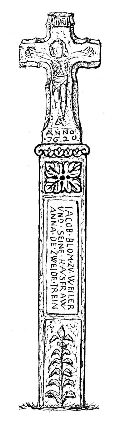 Dieses Kreuz ist nicht mehr vorhanden. Es entstand 1620 und wurde um 1930 durch vorbeifahrende Lastholzwagen mehrmals umgeworfen. Es ist heute durch ein neues ersetzt. Das alte Kreuz war in seiner Form und Gestalt ein gutes Beispiel für die sogenannten Schaftkreuze des Kyllburger Meisters. Es zeigte auf schmalem Schaft im unteren Teil eine Blattpflanze im Relief. Den mittleren Schaftteil nimmt die Inschrift ein, die längs des Schaftes läuft: IACOB BLOM ZV WEILER VND SEINE HAVSFRAW .ANNA DE ZWEIDE TREIN. Oberhalb des Schriftteiles war die sogenannte Kreuzblume im Relief. Darüber als Fries ein Lilienblütenornament. Das Abschlußkreuz schwer und mit schwach gebrochenem Kreuzbalken. Zu Füßen des Korpus die Jahreszahl 1620. - Der Schaft des Kreuzes ging im Zweiten Weltkrieg in Trümmer. Das Kruzifix mit Korpus und Jahreszahl wurde in der äußeren Umfassungsmauer des Friedhofs Kyllburgweiler eingesetzt.