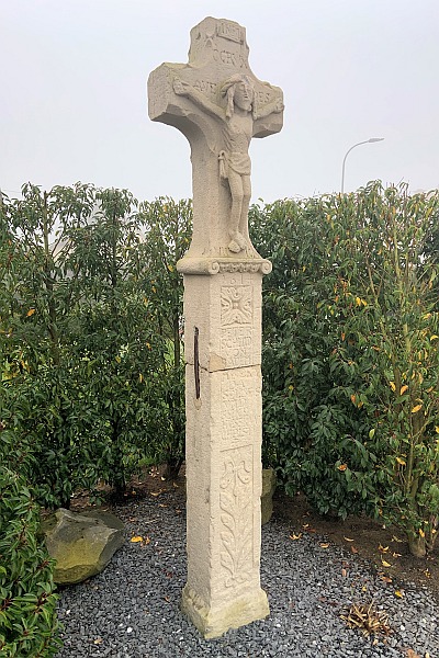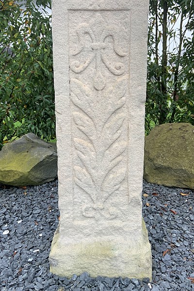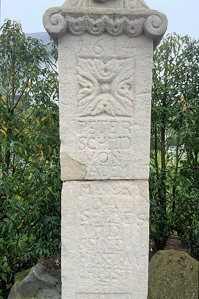 Am oberen Schaftende ist eine Kreuzblume eingehauen, darüber die Jahreszahl 1614. Das aufgesetzte Kreuz wirkt schwer im Verhältnis zum schlanken Schaft. Kreuzarme und Kreuzbalken tragen die Inschrift: