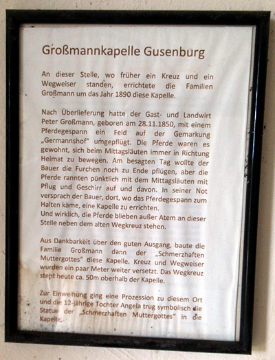 Die alte Weinstraße, die von der Mosel über den Lascheider Hof nach dem ausgestorbenen Ort Grenderich und weiter nach Wadrill führte, kreuzt südöstlich von Gusenburg den Weg nach Bierfeld / Sitzerath. An dieser Wegkreuzung standen vor 80 Jahren schon zwei Holzkreuze und ein Wegweiser. Um das Jahr 1910 muss es gewesen sein, als ein Pferdefuhrwerk der Familie Großmann im Unterdorf von Gusenburg an spielenden Kindern vorbeifuhr. Durch deren Lärm erschreckt, scheuten die Pferde und rannten mit den auf dem Wagen sitzenden Menschen in Richtung der oben genannten Wegkreuzung. In seiner Not versprach der Bauer, dort, wo das Gespann zum Halten käme, eine Kapelle zu errichten.