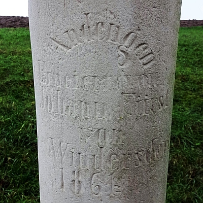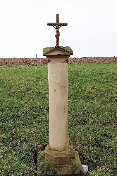 Auf quadratischem Sockel und achteckigem Fuß stehende Sandsteinsäule mit cippusartiger Giebelbekrönung und kleinem Rundholzkreuz. Am Schaft die auf eine Erneuerung hinweisende Inschrift: