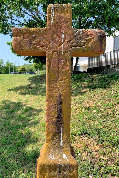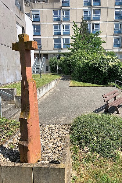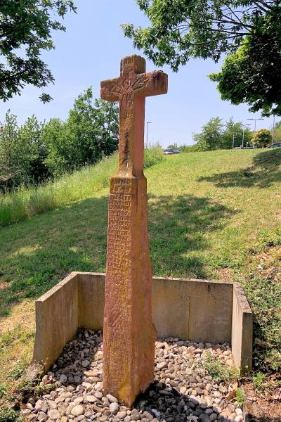 Im Garten des Kreiskrankenhauses Sankt Elisabeth das Verlassen Kreuz. Das Sandsteinkreuz auf hohem konischen Schaft war ursprünglich an der alten Poststraße in der Nähe der alten, heute verschwundenen Ziegelei von dem Schwiegersohn und dem Sohn des 1638 verstorbenen Bäckermeisters Zeitzigius in Erfüllung eines Gelübdes errichtet worden.