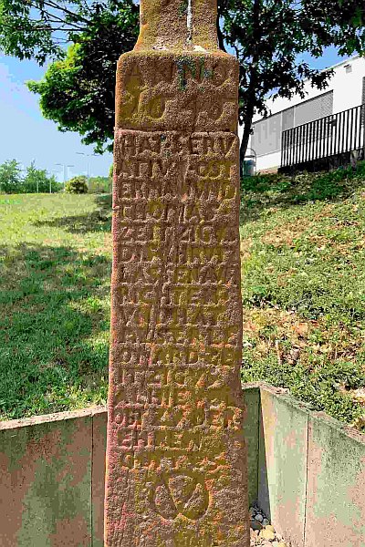 Das Aufsatzkreuz mit den eingeritzten Wundmalen Christi ist Anno 1645" datiert; der Schaft trägt eine Inschrift, darunter eine Brezel als Berufszeichen. [1]