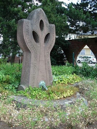 Der Brunnen vor dem Toreingang 1954 vom Bildhauer Hanns Scherl für die gefallenen Schüler und Lehrer errichtet. [1]
