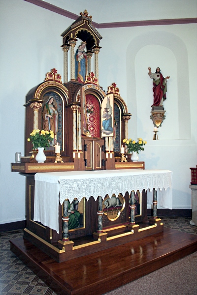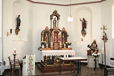 Die Inneneinrichtung stammt wie die Glasfenster weitgehend aus dem letzten Drittel des 19. Jahrhunderts. Zur Ausstattung der Kirche gehören noch ein 75 cm großes Kruzifix und ein Sakramentshäuschen, das außen über der Eingangstür eingebaut wurde.