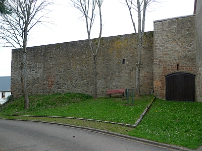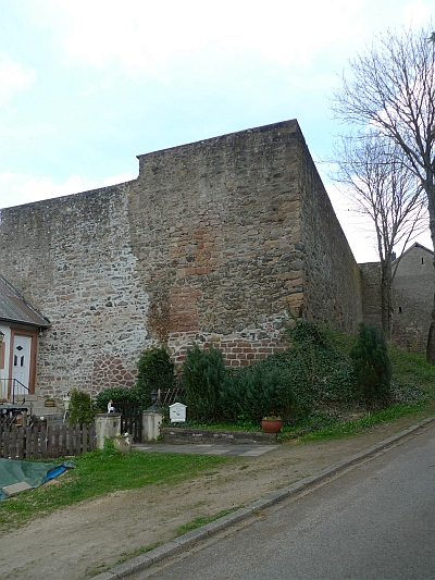 Ortsbefestigung: Rest der Umfassungsmauer der hochmittelalterlichen ehemaligen Wasserburg. [1]