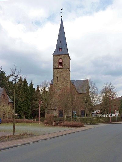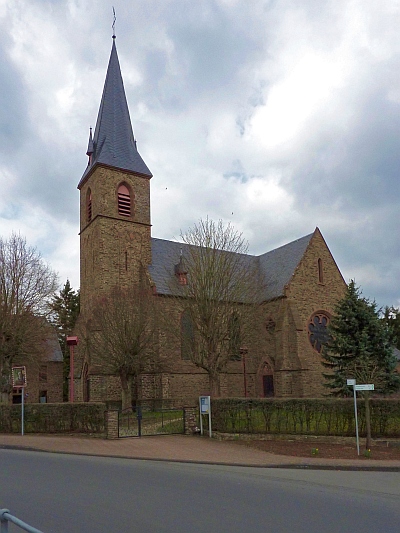 Erbaut von Julius Wirtz, Trier (1900-01). Kleiner neugotischer Saal aus Bruchstein. Seitlich vorgelagert das Pfarrhaus von 1906. [1]