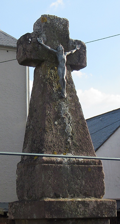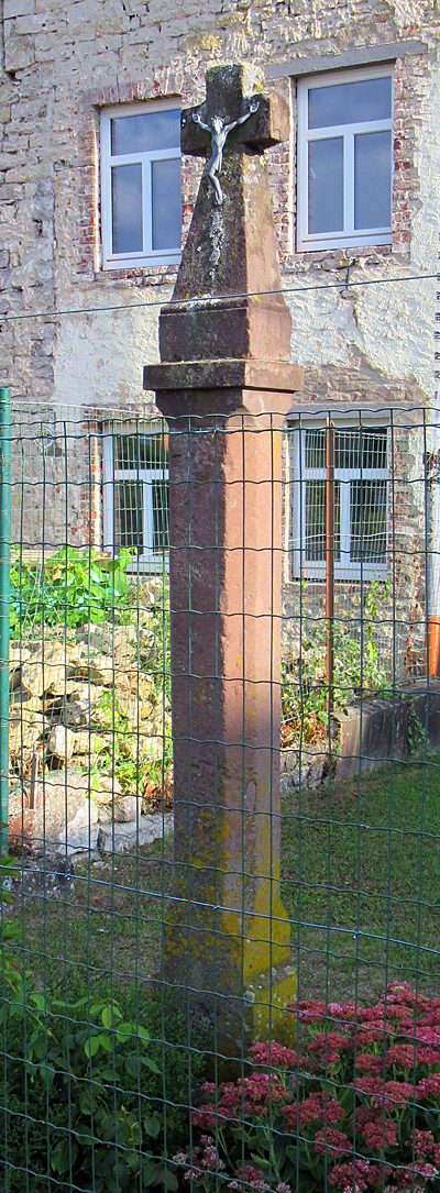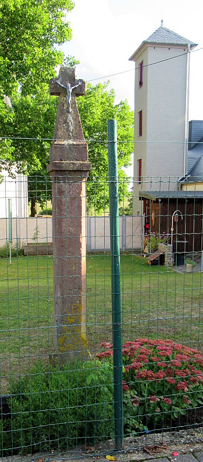 Einem spätgotischen Wegekreuzschaft mit Kantenabfassung im Garten zur Hüttinger Straße hin sitzt über neuem Kapitell ein Abschlußkreuz mit geböscht anlaufendem Stamm und gotisierenden Nasen auf. [1]