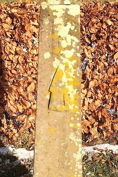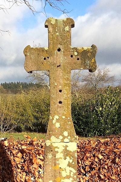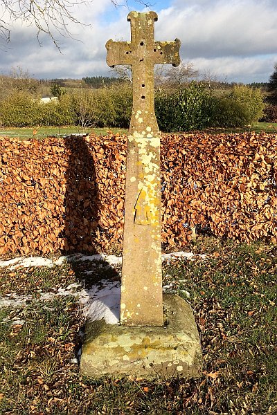 Schaftkreuz in altem Fundamentstein aus dem Jahr 1693. In der Schaftmitte befindet sich das stark plastische Relief einer Pflugschar. Das als Ankerkreuz ausgebildete Abschlußkreuz sitzt zäsurlos auf dem Schaft. Der Metallkorpus wurde in jüngerer Zeit hinzugefügt. [1]