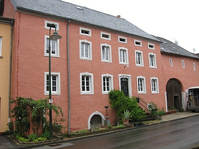 Barockes Wohnhaus von 1773, Stube mit originaler Takenanlage, vom Umbau um 1900 .Terazzoböden und Jugendstil-Wandverkleidung, Scheunenanbau mit rundbogiger Torfahrt .