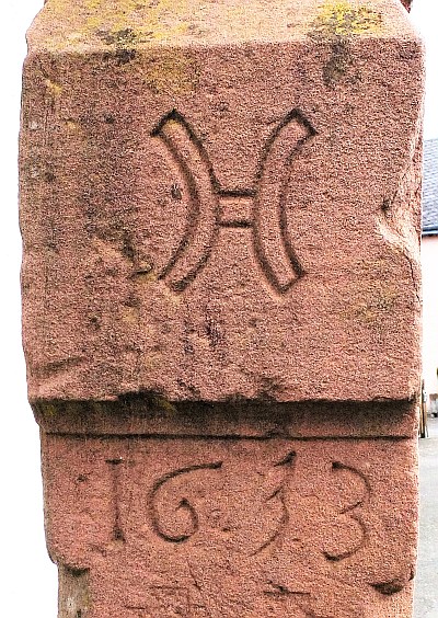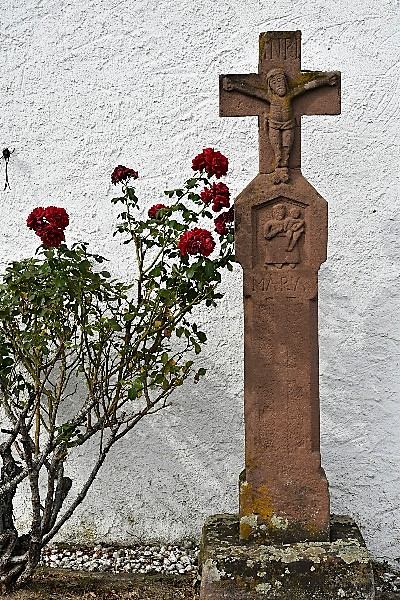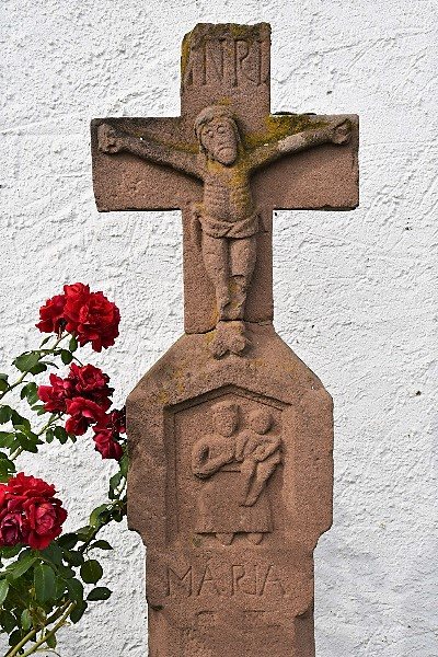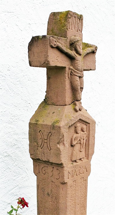 Gut erhaltenes Wegekreuz, das die Gottesmutter darstellt und in einem Kruzifix endet. Das auf der linken Seite auf 1633 datierte Monument weist die Marke eines Weckbäckers auf. Auf der Rückseite ist ein Kelch unter einem IHS-Monogramm dargestellt. [1]