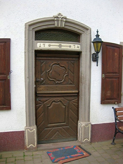 Das spätbarocke Oberlichtportal aus dem Jahre 1774 zeichnet sich durch die für seine Entstehungszeit typische Form seines Scheitelsteins aus. Es umschließt ein Türblatt mit Füllungen in Rokokoformen.