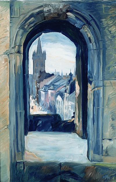 Bild 2: Max Lazarus: Blick durch ein Fenster der Porta Nigra auf St. Gangolf, 1926. © Stadtmuseum Simeonstift Trier.