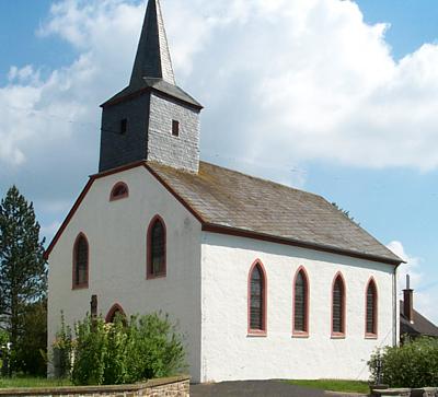 Nachbarocker Saalbau mit Giebeldachreiter, neugotische Motive, 1877/78, Architekt Thüll, Daleiden; Ausstattung, byzantinisierende Chorausmalung; auf dem Kirchenvorplatz Taufstein, angeblich romanisch; Schaftkreuz, bezeichnet 1822. [1]