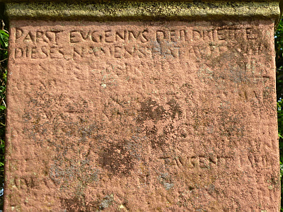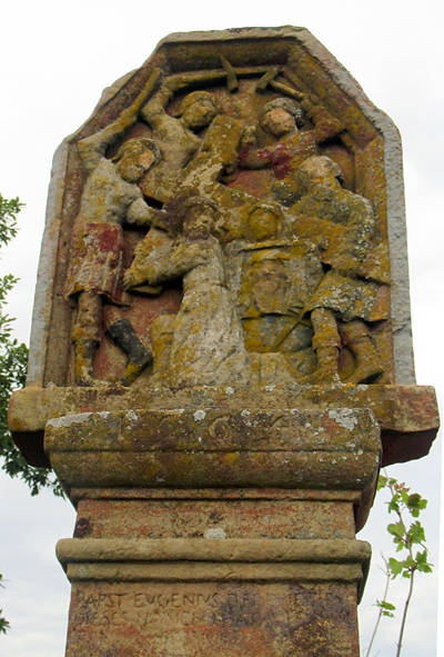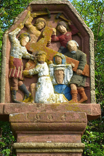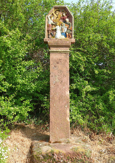 Etwa 2,7 Meter hoher Sandstein-Bildstock aus vierkantigem Pfeilerschaft mit verwitterter Inschrift und dreiseitig geschlossenem Reliefaufsatz mit figurenreicher szenischer Darstellung der Kreuztragung samt heiliger Veronika. Am Kapitell die Datierung 1664.