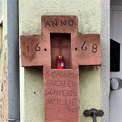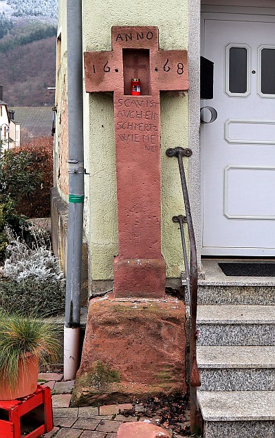 An das Haus angelehntes, schlichtes, hohes Balkenkreuz mit kurzen Kreuzbalken und eingelassener Rechtecknische. Das Sandsteinkreuz auf Setzstein ist an den Kreuzbalken ANNO 1668 bezeichnet. Die Inschrift des für die Errichtungszeit typischen Kreuzes ist nicht vollständig und unverständlich. [1]